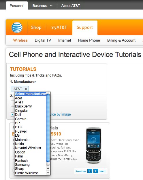 The result was not the iPhone tutorial I expected, but a generic web page titled Cell Phone and Interactive Device Tutorials. I think to myself, “That’s dumb – why not just link directly to the iPhone tutorial like the link said?” But what the hell, maybe AT&T’s websites are so poorly designed that they didn’t allow internal linking. So I dutifully clicked the Manufacturer drop down to choose Apple, and…